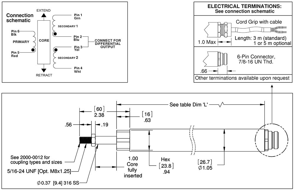 Alliance Sensors Group's LA-27-A series LVDT linear position sensors are designed to handle extreme industrial environments. This robust linear sensor has a thick wall aluminum housing (also available in stainless steel), a core enclosed inside of the core extension rod assembly that cannot break loose, while offering a sturdy male thread for easy mechanical connection, and a pair of double contact shaft seals to keep fluids and solid contaminants out of its bore. The sensor’s electrical termination includes the choice of an axial connector or a cord grip with a cable.